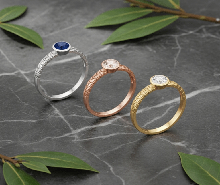 Por eso trabajamos los con metales reciclados —plata de ley, oro rosa 14K y oro amarillo 18K— y piedras creadas en laboratorio. Este enfoque reduce el impacto medioambiental, evita la minería destructiva y garantiza trazabilidad y ética en cada paso.